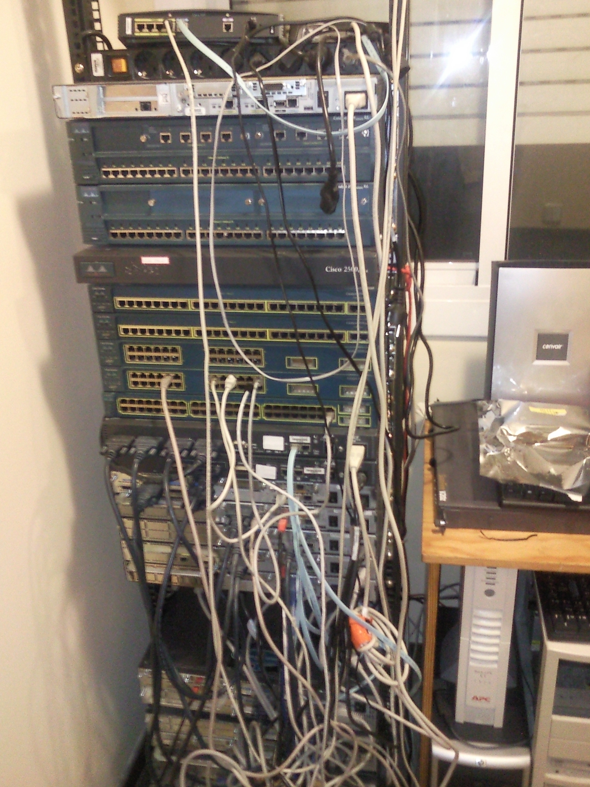 Entre abril y mayo de 2010, compré dos enrutadores Cisco de la serie 7200 y 7200vxr, además de dos tarjetas ATM OC-3 y un switch Marconi ForeRunner LE 155, aparte un servidor HP nuevo que había de oferta a muy buen precio. Aproveché también para cambiar la distribución de los cables y dejar más ordenado el rack, y voy hacia el CCIE de Conmutación y Enrutamiento.